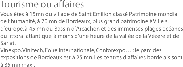 Bordeaux et l'entre-deux-mers Au pied de Saint Emilion, le jardin de l'arbre rouge borde la rivière Dordogne. En plein entre-deux-mers, au milieu des vignobles de Bordeaux, vous apprécierez le calme absolu et la vue spectaculaire sur l'eau qui monte et descend au gré des marées ponctuées par le mascaret. Tourisme ou affaires ? Vous êtes à 15mn du village de Saint Emilion classé Patrimoine mondial de l’humanité, à 20 mn de Bordeaux, plus grand patrimoine 18e d’europe, à 45 mn du Bassin d’Arcachon et des immenses plages océanes du littoral atlantique, à moins d’une heure de la vallée de la Vézère et de Sarlat. Vinexpo, Vinitech, Foire Internationale, Conforexpo… : le parc des expositions de Bordeaux est à 25 mn. Les centres d’affaires bordelais sont à 35 mn maxi. Intérieurs Une ferme 18e et un intérieur contemporain. Un espace ouvert de 200 m2 réunit une zone salon, un ilôt de cuisine et une salle à manger bibliothèque de 12/14 couverts. 500m2 de deck sur 15000 m2 de parc à votre disposition autour de la bâtisse. Cour intérieure, terrasse sur l'eau ou sur le toit, coucher de soleil sur la rivière, c'est vous qui choisissez. En pleine forme piscine chauffée intérieure équipée de nage à contre courant, sauna, hammam, douche donnant sur une cour intérieure paysagée. Sundeck 100 m2 sur le toit équipé de lits de soleil, tente d’ombre, ventilateurs brumisants spa extérieur 7 places salle de fitness au dessus de la piscine parcours hydrothérapie, aromathérapie, chromothérapie (sur RDV) Cyclotourisme et marche à pied : parcours multiples au départ de la maison (routes de campagne et pistes cyclables) A proximité immédiate (- de 5 mn) : centre équestre, courts de tennis, aviron Chambres 90 € Nos chambres font 35 à 50 m2, sont intégralement rénovées dans un style épuré et serein. Elles sont insonorisées et climatisées. Chacune a une vue unique, sur la rivière, sur le village de Saint Emilion… Dans chaque chambre : Salle de bains Toilettes Lit king size 160 cm. TV grand écran, chaines satellites internationales, lecteur DVD Chaîne HiFi Accès WiFi (gratuit) Coin bureau Petit déjeuner à la carte composé de produits frais salés et sucrés sélectionnés. Servi de 8h00 à 10h00 sur les terrasses (tables individuelles) ATTENTION : pour des raisons de sécurité (la maison est en bord de rivière), nous n’admettons pas les enfants de moins de 15 ans tarif chambre double petit déjeuner inclus - lit supplémentaire 30€ sur demande - animaux non admis Dîner 35 € Plancha, grill & wok une viande grillée aux épices et des légumes du marché. Entre deux mers un plateau de fruits de mer. Simple et efficace. Fromages & vins d’ici et d’ailleurs associations de produits à découvrir en plateau dégustation Pasta des pâtes, des pizzas… Toujours entièrement maison. Selon les jours et les menus : table individuelle, comptoir, salle à manger, terrasse… Menus végétariens sur commande Cooking sessions, cours de cuisine (voir les plannings dans les News) Situation Accès Voiture : Bordeaux centre à 25 mn. Calculez votre itinéraire Avion : Aéroport Bordeaux Mérignac à 30 mn Train : TGV Libourne à 5 mn. Location de voitures sur place Hélicoptère : l’arbre rouge dispose d’une hélisurface.